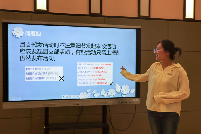 胡磊老师首先对“PU口袋校园”的应用情况和功能定位进行概述:PU口袋校园已纳入高校人才培养学科建设考评体系,引导团体组织发挥作用;课堂成绩单将代替简历,成为社会招录人才的重要依据;PU口袋校园作为高校学生的项目通知平台,可大大提升学生用户参与活动的效率。随后,他讲解了“PU口袋校园”第二课堂管理系统的主要功能和使用方法,重点讲解了如何从PC端发起活动管理、审核活动,以及校园部落的管理和运行方法。随后,校团委办公室负责人徐琪交流了日常PU平台工作中的信息遗漏、重复发布等常见问题,并提出了相应的解决办法,重点对导入学时相关事项进行了具体说明,并对现场提出的问题进行了一一解答。