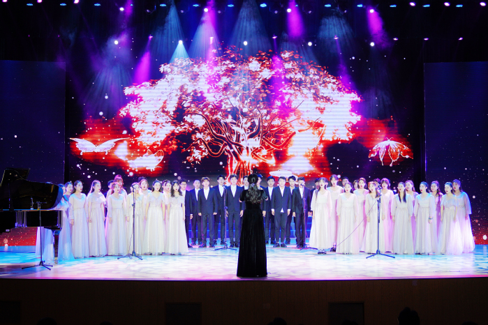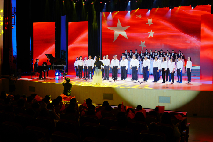 “没有共产党就没有新中国,共产党辛劳为民族,共产党他一心救中国……”全体起立,再次激情唱响《没有共产党就没有新中国》,鲜艳的党旗在师生手中挥舞,嘹亮的歌声在礼堂上空激荡,为汇演画上圆满句号。