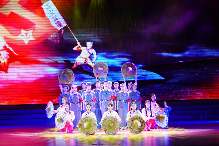 第三篇章中,舞蹈《步调一致》以铿锵有力的旋律、整齐划一的步伐、排山倒海的气势,表现官兵高度集中统一、绝对忠诚可靠的精神风貌,令人热血沸腾。合唱《我相信梦可以像花一样的开》用优美的语言、动人的旋律真情赞美生活,营造出欢快的氛围。舞蹈《民族大团结 永远跟党走》民族特色浓郁,节奏轻盈欢畅,生动再现中华民族大团结的良好风貌,形象表达永远跟党走的坚定决心。“五星红旗迎风飘扬,胜利歌声多么响亮;歌唱我们亲爱的祖国,从今走向繁荣富强……”在曹雨平的领唱下,全体党委委员齐声合唱《歌唱祖国》《没有共产党就没有新中国》,真情歌颂党、歌颂祖国、歌颂社会主义、歌颂改革开放,带领全场观众在催人奋进的旋律中重温党史、凝聚奋进力量。