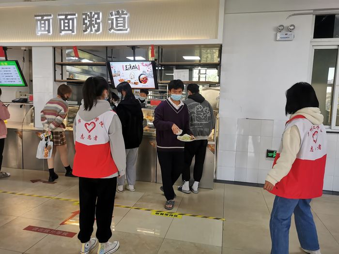 本次志愿服务在辽河路校区和巫山路校区同时招募学生志愿者,招募通知发出后,同学们踊跃报名,共300余名同学参与此项工作。服务期间,志愿者根据时间安排,分早、中、晚三个时间段在食堂相关岗位值班。食堂人流高峰时,志愿者在食堂入口处提醒就餐的同学带好口罩并主动配合测温,在食堂内提醒就餐同学间隔一米排队,保持安全距离,还为忘记带口罩的同学提供了爱心口罩。每一次提醒,每一次帮助,都无不体现了志愿者对疫情防控工作高度的责任感和使命感。就餐结束后,同学们也会在志愿者的引导下,从出口处有序离开。红背心、蓝口罩,成为食堂一道靓丽的风景线,也为这个深秋增添了一份温暖。