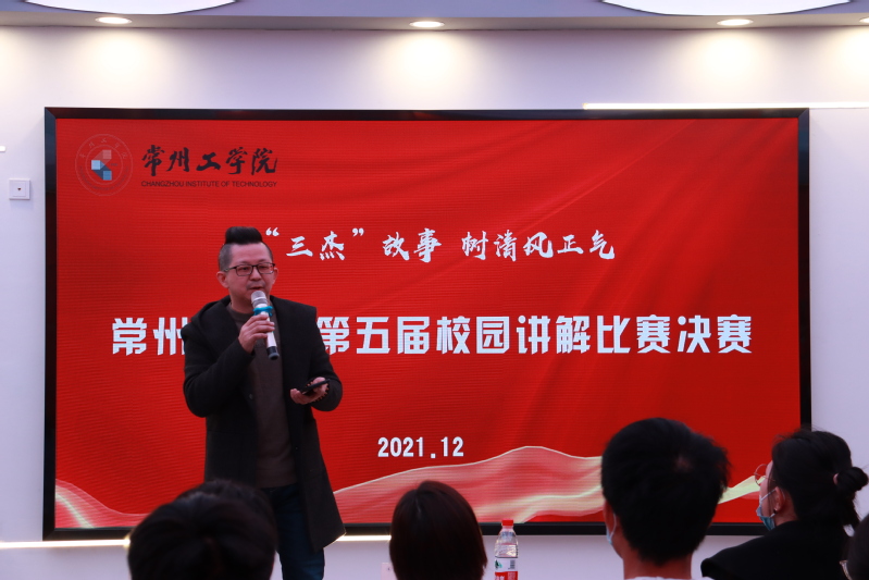 本次比赛分为初赛和决赛两个阶段。初赛于12月1日在文化艺术中心举行,参赛选手对校园景观进行讲解,最终8位选手晋级决赛。12月9日下午,决赛在“常州三杰”情景教室举行,比赛邀请图书馆明湖书社指导老师张军老师、校监督检查室正科级专职纪检员冉丹老师和校团委办公室杨曜宇老师担任评委。
