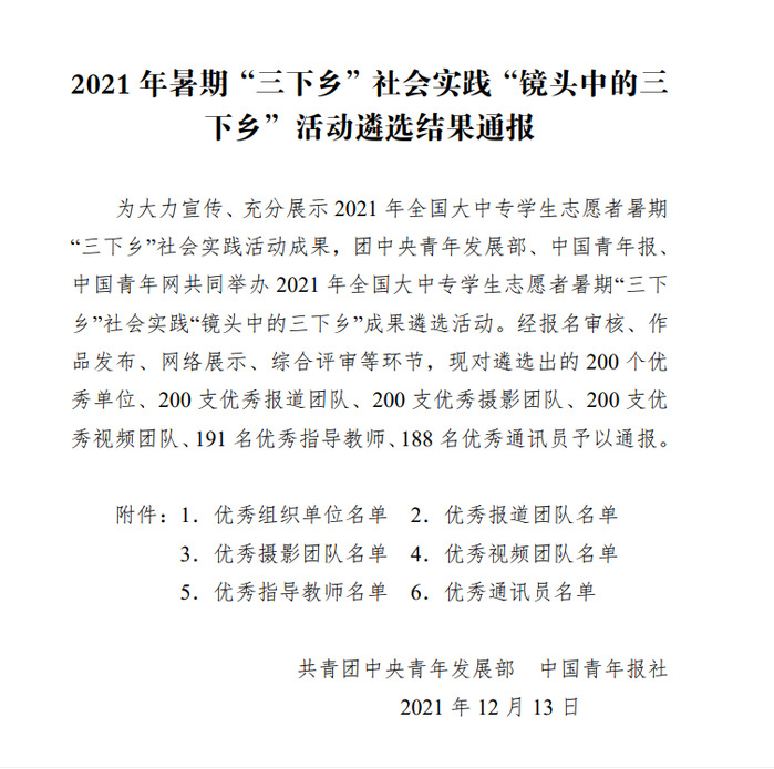 近日,共青团中央通报2021年全国大中专学生志愿者暑期“三下乡”社会实践“镜头中的三下乡”活动遴选结果。我校团委连续两年荣获“优秀组织单位”,经济与管理学院“刻下青春那抹红——‘爱由非遗生践行公益心’”“青春‘益’起来,扶农助农行——乡村振兴调研之旅”两个实践团队获评“优秀视频团队”,师范学院王同灿获评“优秀指导教师”。