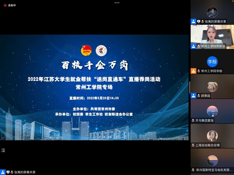 活动邀请到常州星海电子股份有限公司、中商智——能源科技发展(江苏)有限公司、常州天马集团有限公司、福建百宏化学有限公司、特斯特(江苏)检测科技有限公司、常州蓓斯特宝马电机有限公司、江苏环宇康力科技有限公司、常州泉行家矿泉水贸易有限公司、名绘翰文化传播有限公司、魄游网络科技(杭州)有限公司等十家企业,募集岗位150多个,涉及机械设计、智能制造、电气自动化、新能源、软件工程、土木工程、应用化学、财务管理、环境设计等多个专业领域。下午2:00,活动准时开始。常州星海电子股份有限公司等十家企业代表化身主播,依次介绍企业概况、岗位要求、工作内容、薪资待遇、发展前景、管理体系等情况,并与毕业生在线互动,解答有关应聘的问题,帮助同学们更全面地了解企业。活动结束后,毕业生将根据个人实际在线投递个人简历。
