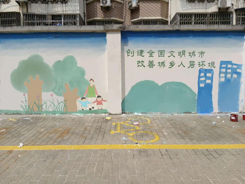 团队成员在烈日酷暑中走进社区,切合文明社区建设需要,在墙面上绘制有“绿色社区”“文明社区”特色的绘画作品,同时与当地居民交流当下新社区建设现状,了解到这些年来社区的环境改善是十分明显的;在墙面绘画过程中,尽管天气炎热但大家都全神贯注于其中没人觉得疲劳,绘画结束后,大家都感到十分自豪,也非常高兴能够为社区文明建设贡献出一份微薄之力。