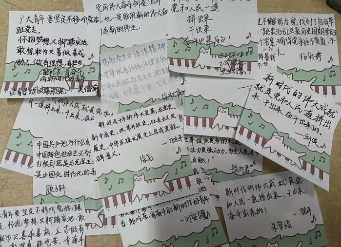 该班团支部书记徐秋悦同学首先带领大家认真学习了党的二十大报告,团支部宣传委员为大家准备了便利贴,倡议大家写下自己最喜欢的金句内容,同学们发表了自己对所选金句的理解与感受。最后,团支部全体成员先后分享了学习感悟。