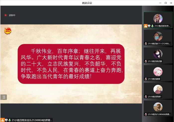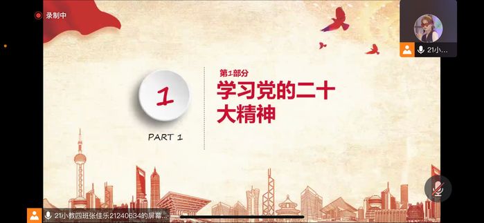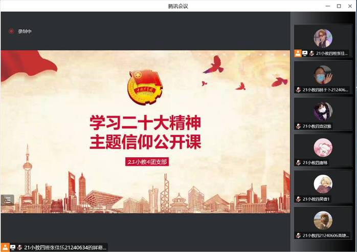 为了深入学习贯彻党的二十大精神,11月22日,21级小教四班团支部通过线上方式开展了以“学习党的二十大精神,争做新时代好青年”为主题的信仰公开课。