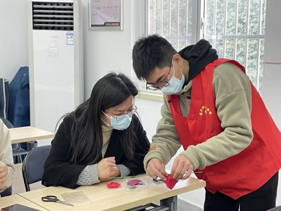 在常州市武进区潞城社区,青年志愿者们与唐丽老师一起感受具有1500多年历史的非遗艺术——剪团花。唐丽老师将党旗、党徽等红色元素与剪纸、团花等传统艺术形式相结合,带领社区居民们在文创实践体验中了解、学习党史。一把剪刀、几张红纸,在居民们的手中灵活翻动,不一会儿,冉冉的红星、精致的党徽、飘扬的党旗等图案就跃然纸上。