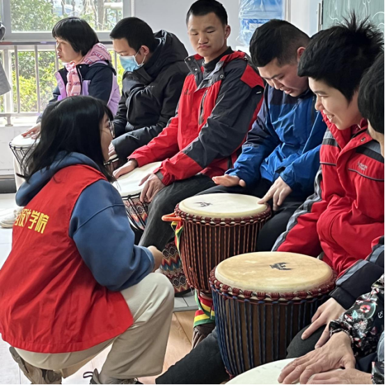 在常州市新北区天禄残疾人庇护中心,艺术与设计学院“爱翼启”志愿服务小分队开展了关爱残疾儿童的非洲鼓音乐教学活动。此项活动为学院于庇护中心的长期志愿服务合作项目,在每周的活动中,残疾儿童与我们的志愿者同学积累了深厚的友谊。在活泼律动的音乐声中,残疾儿童们时而欢笑、时而鼓掌,也为志愿者们带来了感动和满满的成就感。