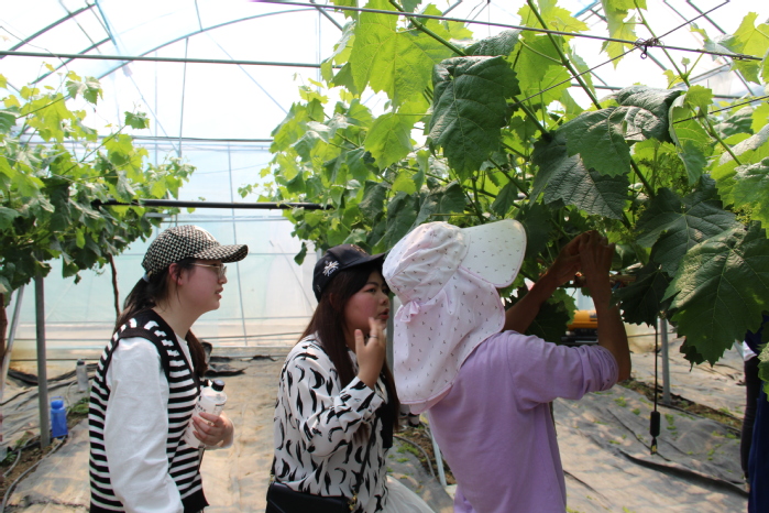 在企业负责人的带领下,一行人来到葡萄生产基地实地考察,深入了解庄园特色葡萄品种、生长培育情况及产销途径。南京金牛湖金山农业科技有限公司宋红梅重点介绍园区的创新发展理念,将普通种植大棚改造成现代化连幢大棚,引进滴灌、水肥一体、遮阴等现代种植设备,使金牛湖葡萄庄园逐步成长为以葡萄产业为主的现代高效农业园。随后双方进行了交流座谈,葡萄技术专家润云龙作葡萄品种和技术管理的介绍并进行植保作业展示。徐霞介绍了学院农业创新创业项目的基本情况,围绕校企合作、基地共建等方面进行深度交流。