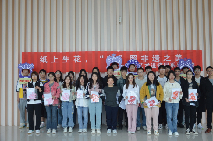传承人王文昌老师介绍了金坛刻纸的发展概况、刻纸技法和刻纸注意事项。同学们挑选自己喜欢的图案后,在传承人老师指导下进行刻纸体验活动。大家在一小时内陆续完成了作品,不约而同露出笑容。与此同时,曹钰皎老师在现场创作了一幅作品——《百花齐放》,寓意56个民族百花齐放,共同建设美好家园。郝雅梦和曹钰皎为参加活动的学院代表——蒙古族学生杜承儒、满族学生冯家锐赠送作品。