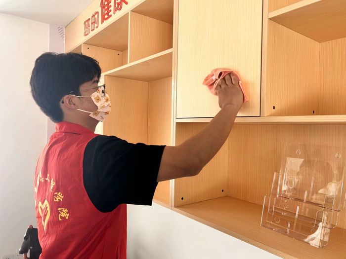 志愿者们还对“爱立方”进行打扫,从擦拭橱窗到修整花草再到扫地拖地,力求为残障人员创造一个干净美丽的工作生活环境。