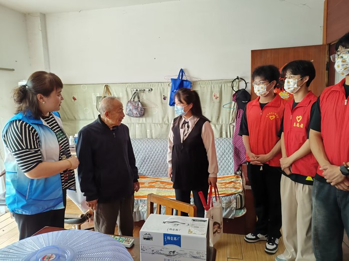 街道工作人员费琴带领志愿者们一同慰问了社区两位80多岁孤寡老人,他们一位要照顾自己有听力残障的弟弟,一位失独且妻子早逝,大家纷纷与老人说话谈心,用言行温暖老人。虽然沟通中存在方言障碍,但是老人们对志愿者们的到来均表示欢迎和欣喜。