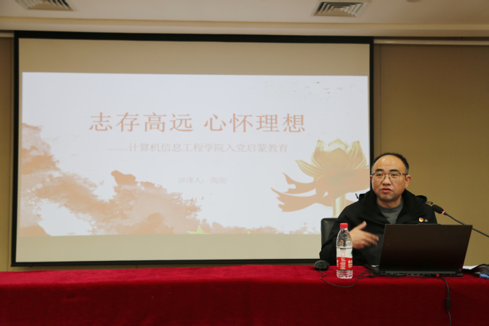 随后,陶骏以《志存高远,心怀理想》为题作入党启蒙教育专题讲座,他从中国共产党的基本知识、大学生为什么要积极入党、大学生应该怎样加入中国共产党三个方面,阐释了中国共产党的基本性质、指导思想、最终目标和现阶段任务等理论知识,解析了党的事业发展与青年知识分子的成长发展之间的密切关系,指导学生熟悉入党条件和发展流程。陶骏鼓励号召同学们积极加入中国共产党,作为新时代的大学生,他希望同学们牢记习近平总书记对青年的要求,立志做有理想、敢担当、能吃苦、肯奋斗的新时代好青年。