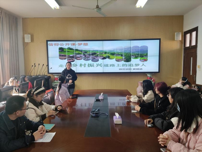 为深入学习贯彻党的二十大精神,全面学习和把握国家乡村振兴战略,增强青年学生的文化自信。12月14日下午,师范学院团委在巫山路校区1号楼421会议室开展了“ 奋斗新时代青春勇担当”信仰公开课,全体团学干部、团员代表及各班普通学生代表参加了本次活动,院团委新媒体中心主任窦婧涵和21小教四班团支书杨雨欣担任主讲。