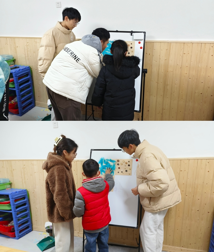 自创“魔墙”,走进世界。同学们为每位孩子准备了不同材质的DIY材料工具,鼓励他们创作一面以“我心中的家”为主题的“魔墙”。大家引导孩子们充分发挥想象力,对其进行耐心协助,并尝试让孩子们进行相互合作、分享经验、交流感受。