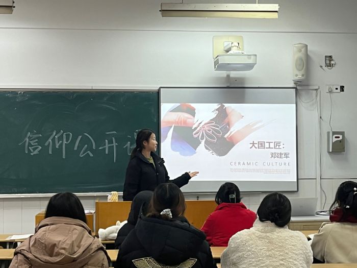 为鼓励同学们坚定理想信念,更好地将个人理想与中国梦相结合,近日“常小燕”大学生理论宣讲团社长、21商英一班冯雨洁开展了主题为“大国工匠:邓建军——与信仰对话 与梦想共舞”信仰公开课。