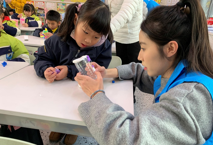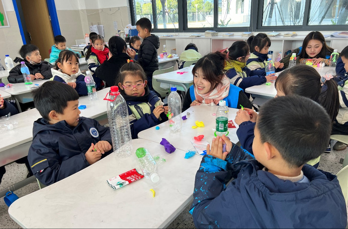 变废为宝,绿色共享。同学们首先与小朋友们分享了垃圾处理与分类的相关知识,让小朋友们意识到废弃物并非一无是处,通过巧妙的手工制作,我们可以给废弃物赋予新的生命和价值,为环境保护贡献一份力量。随后,在同学们的引导下,小朋友们进行了一场“变废为宝”手工制作活动,将生活废弃品经过自己的创作变为精美的手工艺品,这不仅锻炼了孩子们的想象力和动手能力,同时也让创新与艺术的种子在小朋友们的心里生根发芽。