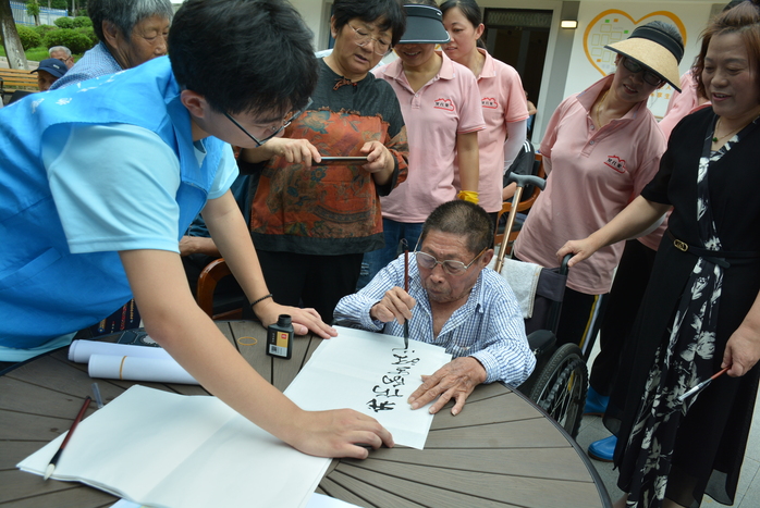 老年书法蕴神韵,歌声悠扬颂真情。初入敬老院,老人们明显有些局促,好在敬老院工作人员带头唱起了红歌,熟悉的旋律引得老人和实践团成员轻轻跟着和了起来。随后,在志愿者们的热情互动和积极邀请下,老人们主动展现自身技能,有人挥毫泼墨,书写老来之福;有人轻轻起舞,续写多彩生活;有人吟唱戏曲,追忆峥嵘岁月。紧接着,实践团成员着眼“提升老人生活质量,奉献常工学子爱心”,结合宣传海报向老人宣讲膳食营养,希望老人能够吃的营养,活的健康。