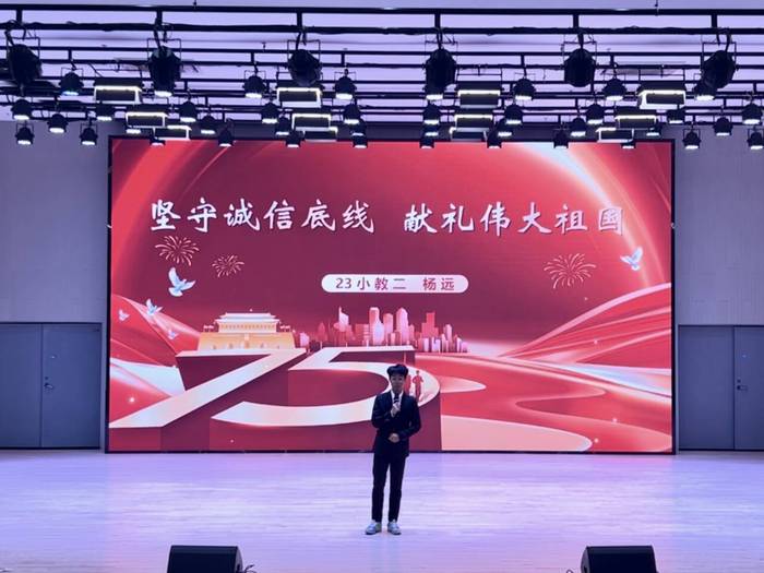 歌诵交织爱国意,诚信演讲掌声扬。23小教二班杨远同学的主题演讲《坚守诚信底线献礼伟大祖国》深刻阐述了诚信对于个人成长和社会发展的重要性,赢得了在场观众的阵阵掌声。23小教一班毛婷、潘诗琪、邵欣瑜三位同学通过讲述红色故事,带领大家重温了那段激情燃烧的岁月,她们激昂的演讲,让革命先辈的英勇无畏形象跃然台上。