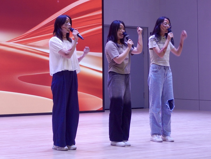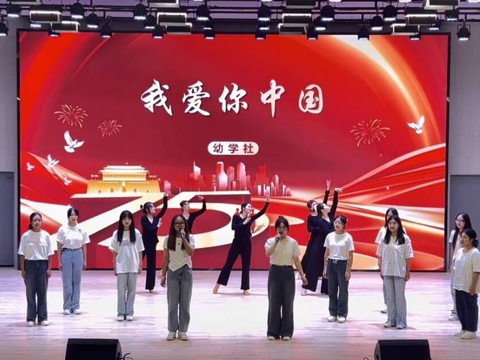 唱响红色歌曲,厚植爱党爱国情怀。23小教三班江南、李昀芹、潘怡彤同学用歌声穿越时空,展现了永不褪色的家国情怀;幼学社同学们带来的歌曲《我爱你中国》,歌声激昂颂祖国,红旗飘扬映深情,将现场气氛推向了顶点。激昂的歌声、挥舞的红旗,共同汇聚成一片红色的海洋,展现了师范学院学子对祖国的深情厚谊和无限热爱。最后,现场所有师生齐声高唱《我和我的祖国》,嘹亮的歌声如潮水般涌动,每一句歌词都饱含深情,每一面小国旗的挥舞都是对祖国最真挚的告白。在这一刻,“请党放心,强国有我”的誓言响彻云霄,它不仅仅是一句简单的口号,而是新时代青年内心深处对党的无限忠诚、对祖国的深情厚爱,以及对自我使命的清晰认知与坚定承诺。