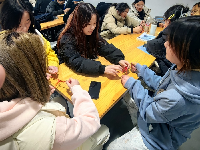 活动前,团支书带领大家学习了2014年习近平总书记前往呼和浩特儿童福利院看望残疾儿童时说的话“有一颗感恩的心很重要,所有的人都要有感恩的心”,引导班级同学学会感恩,以实际行动感恩祖国、社会、父母。随后组织班级同学通过编织同心结来寄予自己的感恩情怀。在线与线的交叉中,在视频的指导下,祥云结、团锦结等多种样式同心结被编织出来。虽然过程可能比较繁琐,需要多次尝试并从头开始,但大家都坚持去完成。