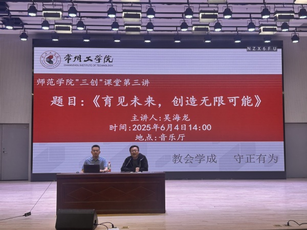 为积极落实学校双进行动要求,6月4日下午,师范学院在粹化楼音乐厅举办“三创”课堂第三讲《育见未来,创造无限可能》。本次活动特邀常州工学院产业教授、竞越科技总经理吴海龙为主讲人,来自全院130余名同学参加。活动由党委副书记王爱祥主持。
