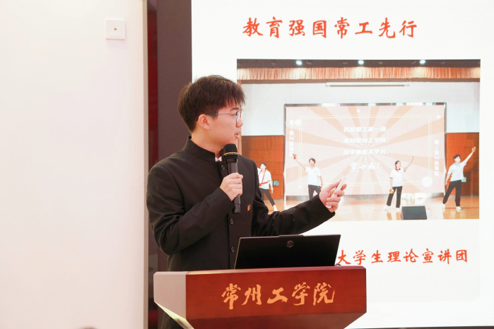 学院学生会主席、宣讲团成员王于豪从瞿秋白、张太雷、恽代英的革命故事切入,生动讲述“常州三杰”以“愿化惊雷碎旧世界”的豪情投身革命,用思想与行动点燃时代火种的热血历程。谈及新时代使命,王于豪紧扣“教育强国与青年担当”,结合常州工学院“三杰班”创建、“常小燕”宣讲团等育人实践,分享班级传承红色基因的探索。他以“青衿之志,履践致远”为引,号召青年坚定理想,将个人成长融入教育强国建设,既要扎根专业,以产教融合为径提升实践能力,呼应“新能源之都”“智造名城”发展需求,更要摒弃功利,以“功成不必在我”的胸怀,到祖国需要处奉献青春,让“请党放心,强国有我”的誓言落地生根。