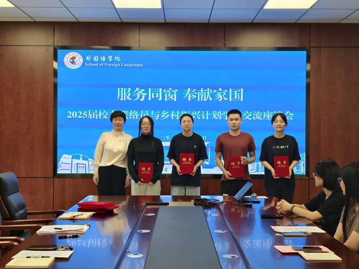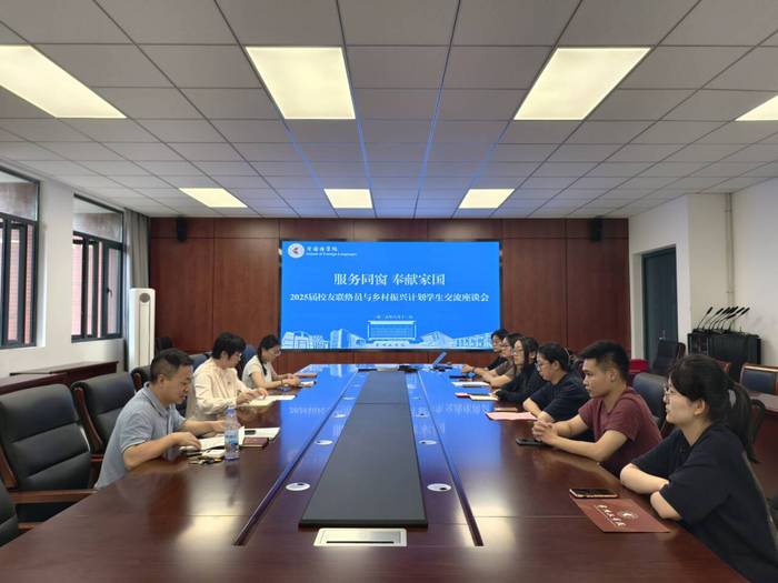 6 月 12 日, 外国语学院组织召开2025届校友联络员与乡村振兴计划学生交流座谈会。党委书记许文婷、副书记俞贤辉、全体辅导员、毕业班校友联络员和乡村振兴计划志愿者参会。