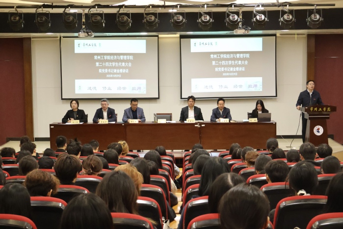 大会在庄严的国歌声中拉开帷幕。首先,戴一轩代表校学生会致贺词,她充分肯定了经管学院学生会近年来的工作,并期望校院两级学生会后续加强合作,携手提升服务广大同学的质量与效能。随后,院党委书记谢金楼代表学院党委对大会的召开表示热烈祝贺,他由衷感谢学生骨干们的辛勤努力。结合刚刚闭幕的党的二十届四中全会精神,谢金楼向全体学生代表和青年学生提出三点期望:一是坚定理想信念,争做有方向的奋进者;二是坚持服务同学,争做有温度的担当者;三是勇于开拓创新,争做有作为的引领者。