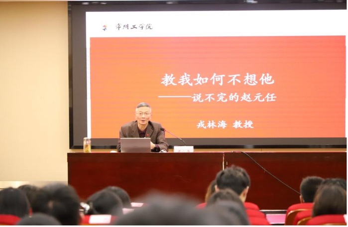 10月23日,校老科协与团委联合举办《教我如何不想他——说不完的赵元任》科普讲座,校老科协副会长、常州市语言学会会长戎林海教授应邀主讲,现场110位学生聆听。