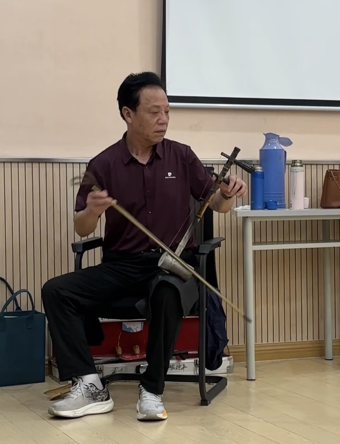 本次活动潘凤金带领社员学唱《凤还巢》中的经典唱段。《凤还巢》作为梅派京剧的代表作之一,其唱段以旋律优美、情感细腻、韵味醇厚著称,既要求演唱者兼具嗓音亮度与情感深度,也对伴奏的契合度提出了极高要求。在这场以唱腔学习为核心的活动中,张建平二胡伴奏的灵动演绎成为点睛之笔,不仅为唱腔提供了坚实支撑,更让经典唱段的艺术感染力得到极致释放,让学习者深刻体会到 “弦音与戏韵共生” 的戏曲美学,成为学习者理解唱腔、融入角色的重要桥梁。