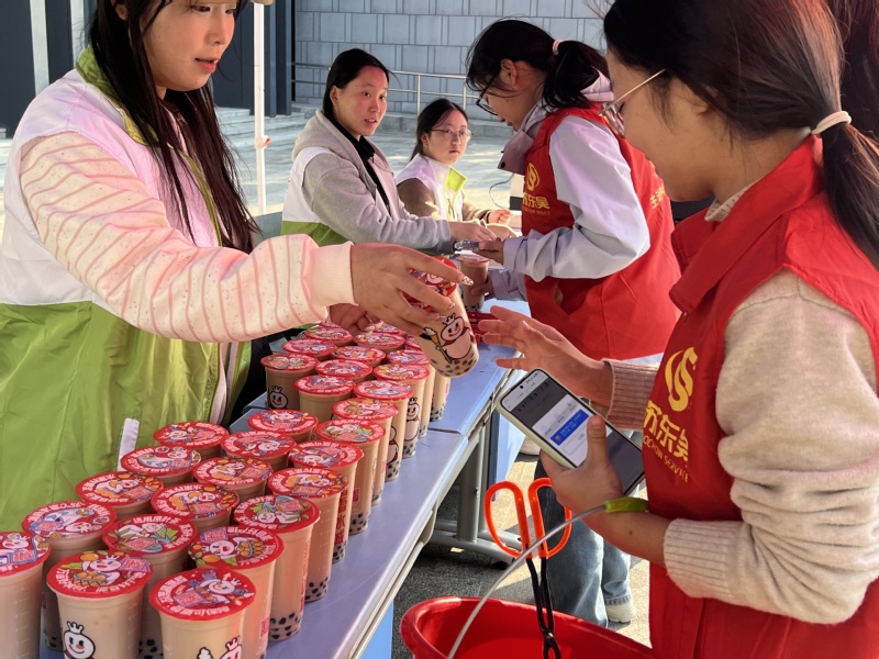 活动筹备阶段,两大社团志愿者团队提前谋划、分工协作,严格筛选优质奶茶饮品,细致核对领取人员信息,高效完成临时服务点搭建等前期准备工作。下午13:30,活动准时启动。图书馆西广场现场秩序井然、氛围热烈。志愿者们热情接待每一位前来领取饮品的同学,耐心讲解领取流程及相关须知;针对仍在图书馆内自习的同学,志愿者专门采取轻声提醒的方式告知活动信息,确保这份冬日关怀精准送达每一位目标同学手中。