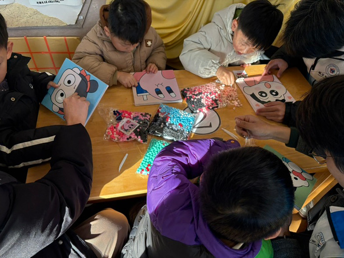 活动现场,25航艺三班的志愿者们提前准备了色彩鲜艳的毛绒材料、安全剪刀、环保胶水等工具,通过趣味动画短片引出手工主题,用生动易懂的语言讲解毛绒挂件的制作步骤。孩子们在志愿者的耐心指导下,小心翼翼地裁剪、拼接、粘贴,发挥天马行空的想象力,将普通的毛绒材料变成了可爱的毛毡画。过程中,志愿者们手把手协助孩子们解决操作难题,时而弯腰示范,时而轻声鼓励,活动室里充满了欢声笑语,指尖的温度与创意的火花相互交融。