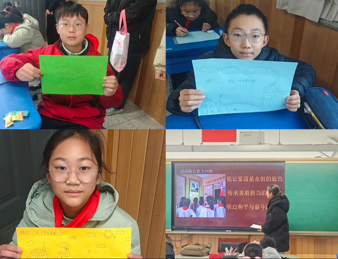 在“和平家园创作”环节,孩子们拿起彩笔,在纸上勾勒出带着炊烟的房屋、飘着云朵的蓝天,写下“铭记一二·九,少年当自强”的稚嫩字迹。志愿者们也和小朋友一起创作,在画中添上戴红领巾的守护者和象征安宁的飞鸟与鲜花。