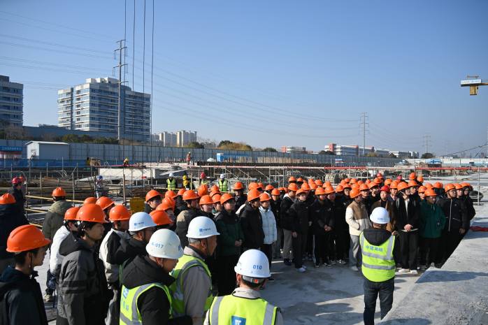 项目部总工程师熊锐、项目技术负责人金龙及项目管理团队热情接待了师生一行,详细介绍了项目整体建设情况,重点分享了BIM技术应用、“跳仓法”施工等特色工艺。随后,师生们深入施工现场,工作人员结合实体工程,直观讲解施工流程与现场管理要点,同学们围绕现场场景积极提问交流,收获颇丰。