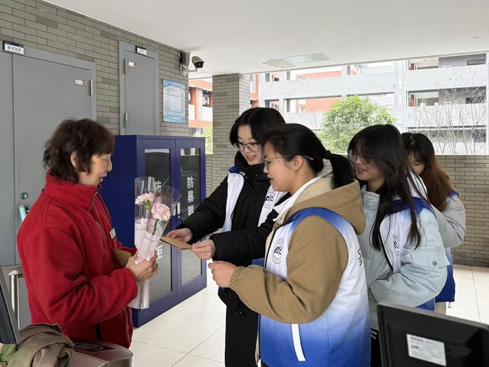 活动尾声,同学们将提前准备的贺卡和鲜花送到宿管阿姨手中。一张张手写的祝福、一束束芬芳的鲜花,承载着同学们对阿姨们日复一日坚守岗位、默默守护的感激之情,也提前为她们送上了“三八”国际妇女节的美好祝愿。