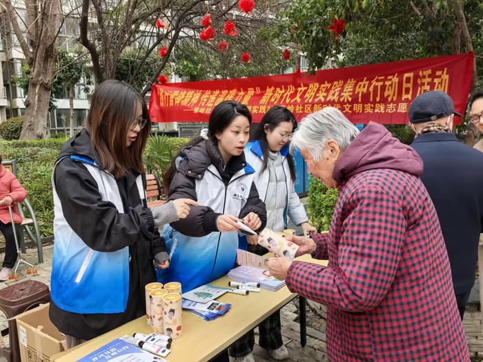 在秦岭社区,志愿者化身“文明宣传员”,通过设点宣传、发放资料,向居民普及反诈防骗、扫黄打非、垃圾分类等知识,并参与旧衣回收公益项目宣传,为社区老人细致讲解环保理念,助力绿色公益深入人心。